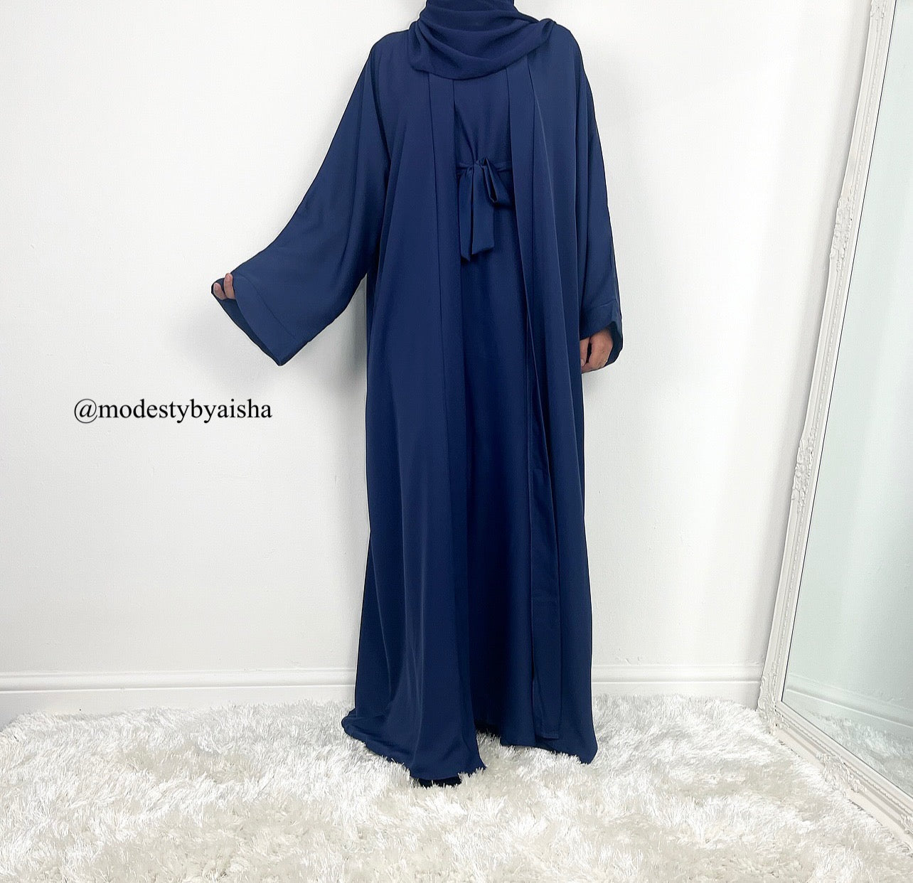 Ava is the ultimate 4 piece abaya set. The perfectly cut straight open abaya comes with a short sleeve slip dress that flows beautifully underneath. It also comes with a matching hijab and belt.