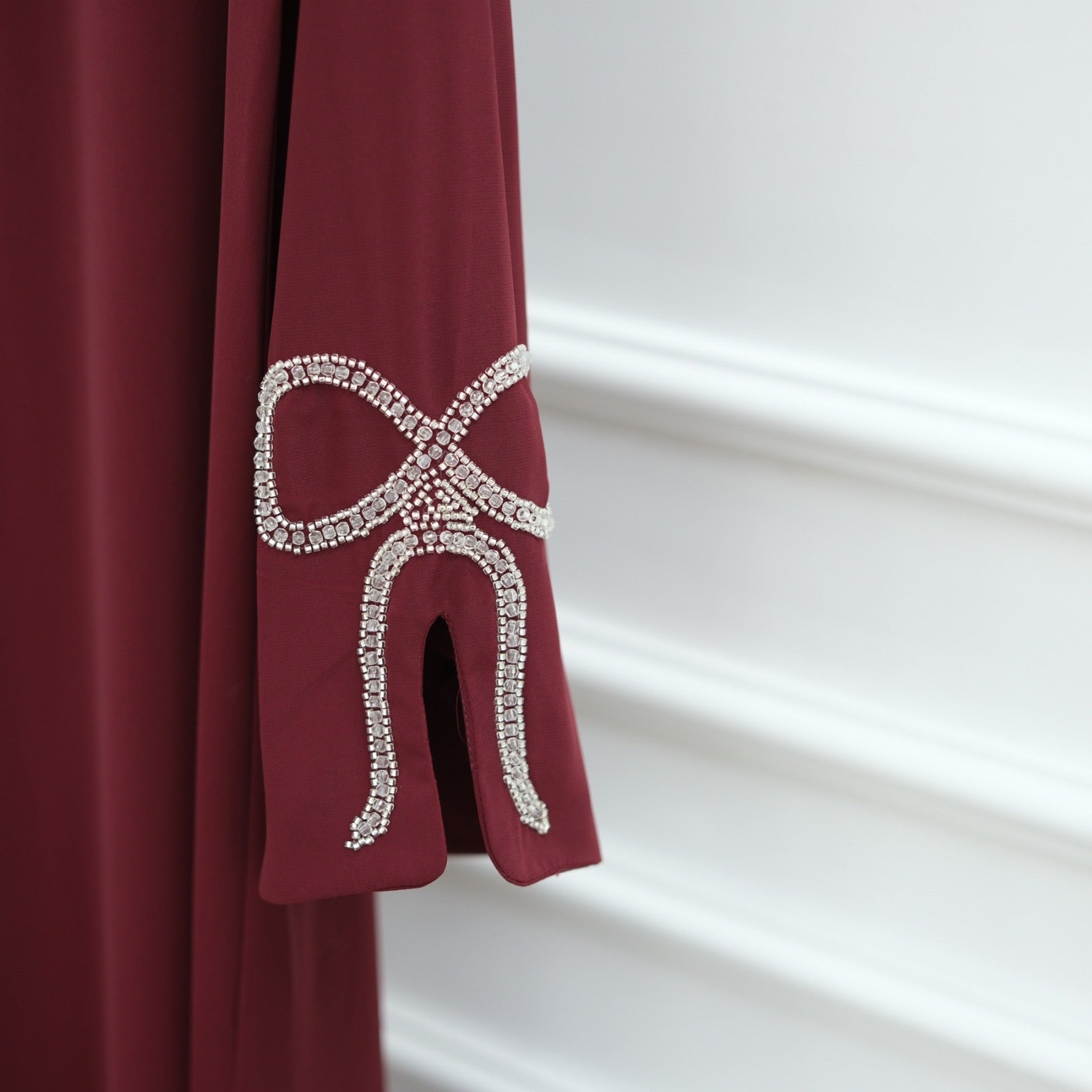 This elegant Bow Embellished Closed Abaya is crafted from premium Nidha fabric. It stands out with exquisite silver beaded bows on the sleeves - each intricately handcrafted. It is a perfect choice for both formal occasions and elevated everyday wear.