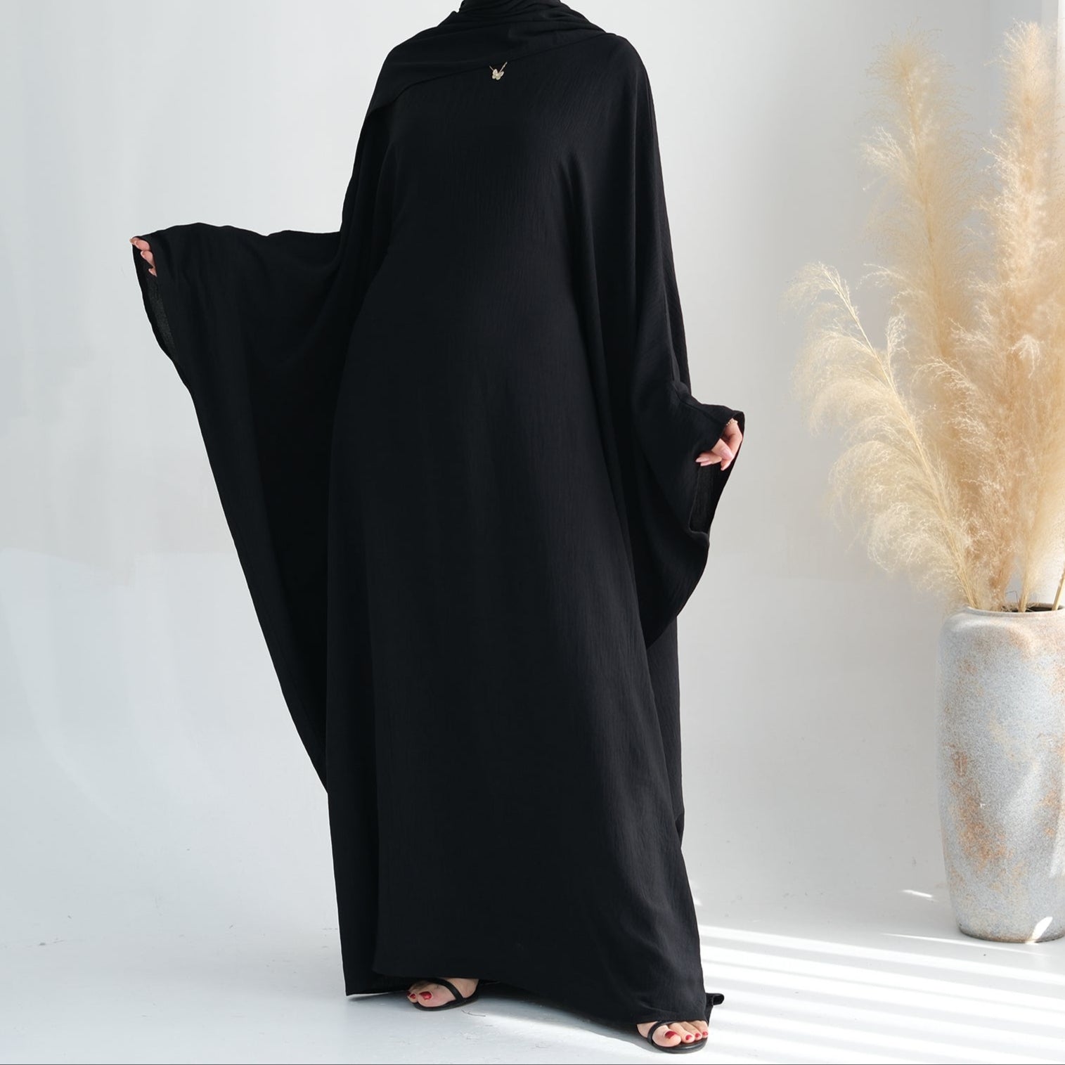 A beautiful abaya cut in a butterfly style made in a premium crepe fabric and hand stitching. Perfect for any occasion for an elegant and classy modest look.