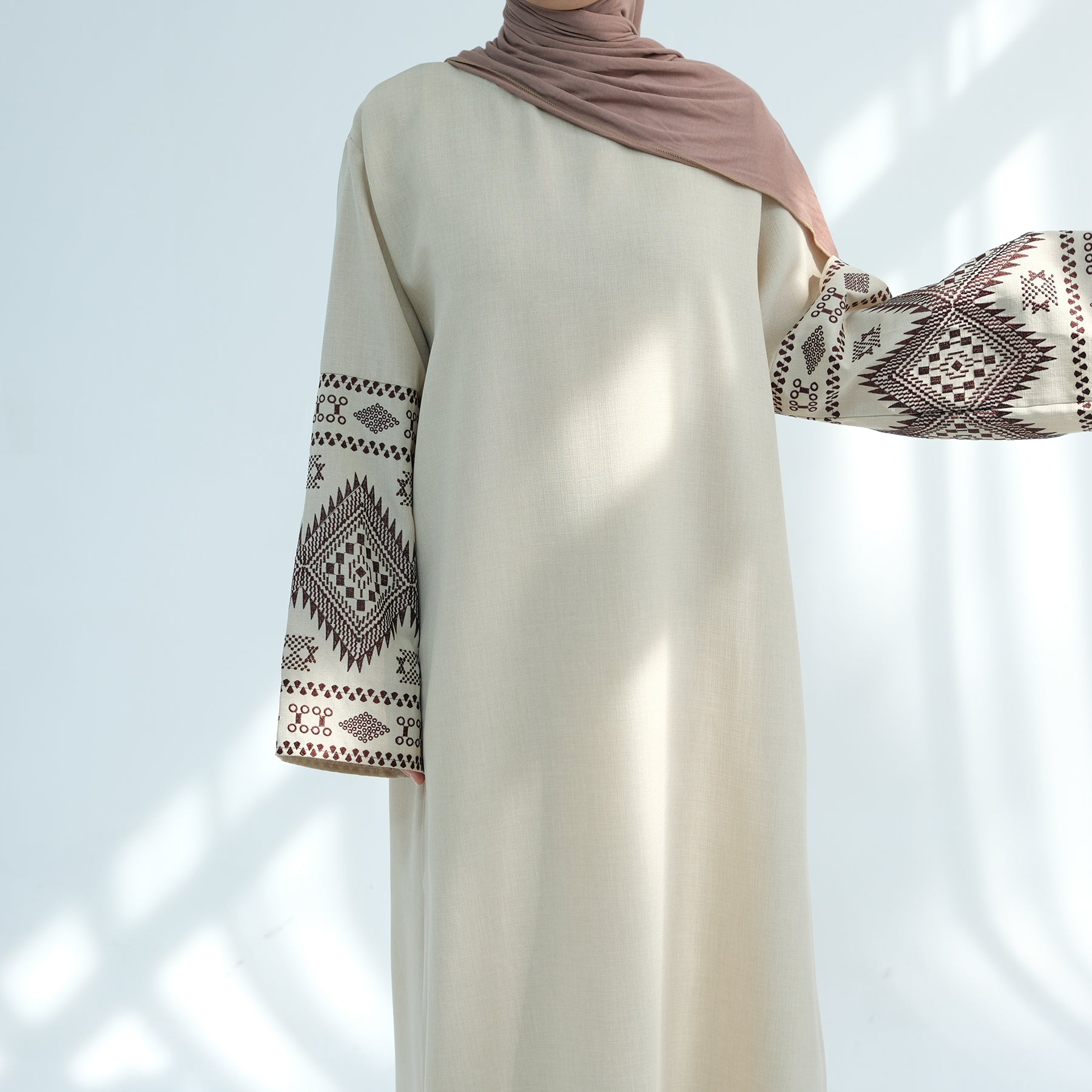 Our Embroidered Closed Linen Abaya is a perfect addition to your modest wardrobe. The sleeves have intricate thread embroidery elevating the look. Crafted from breathable and durable linen material fabric.