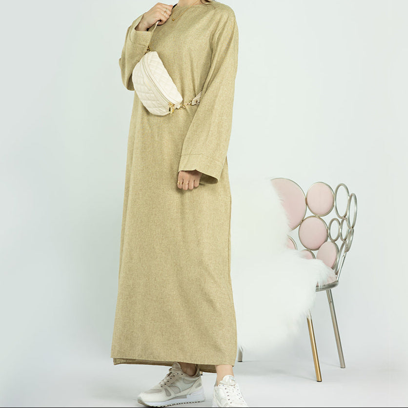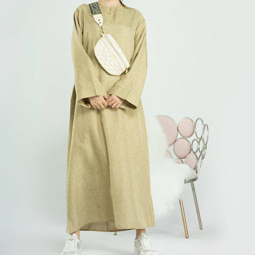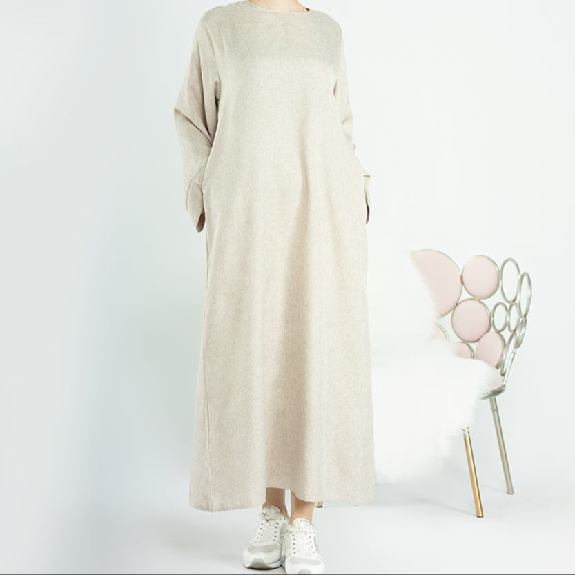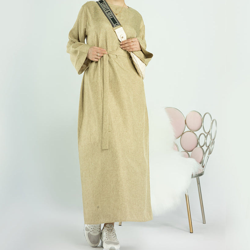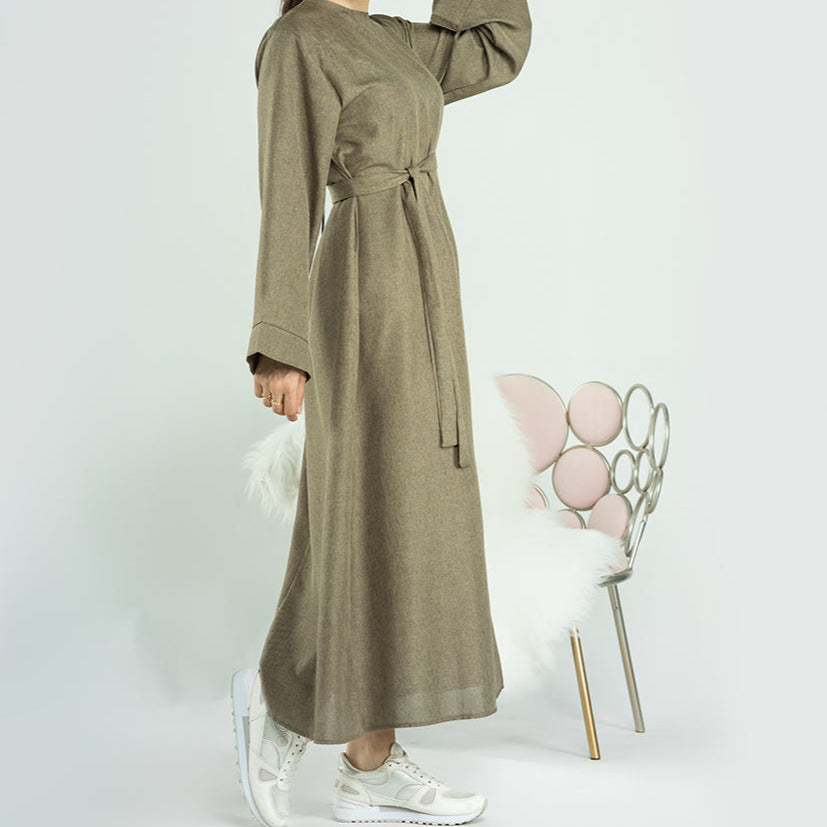 Hind is the ultimate, straight cut linen abaya. Cut from a stunning, thicker linen fabric for extra warmth and full coverage simultaneously. It has wide sleeves, pockets and comes with a belt.