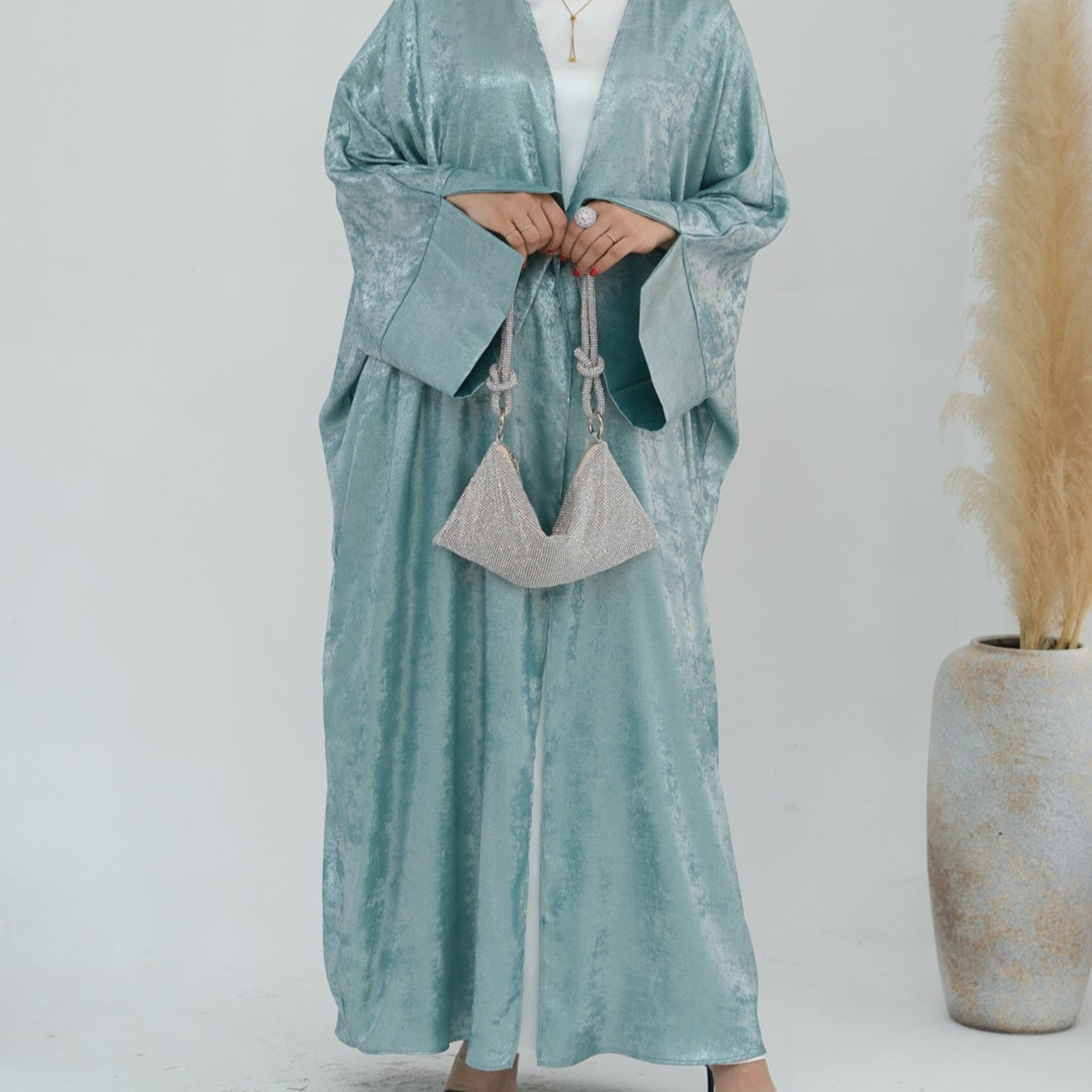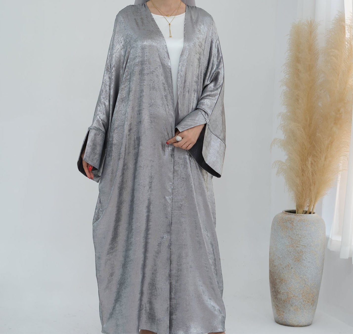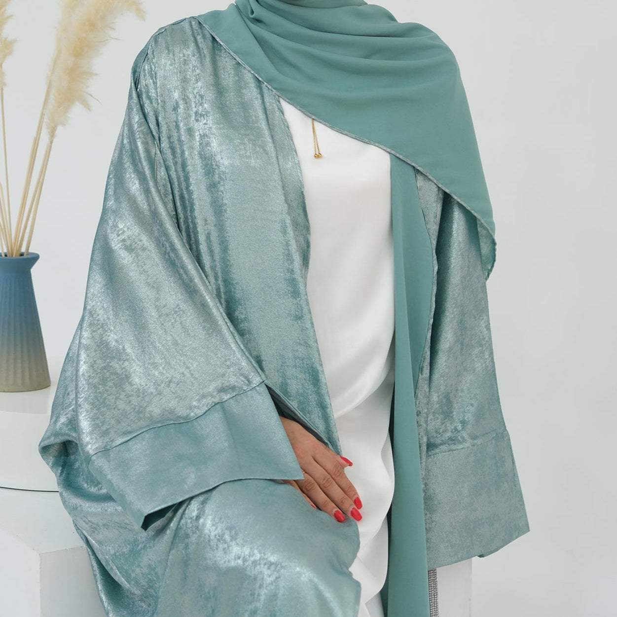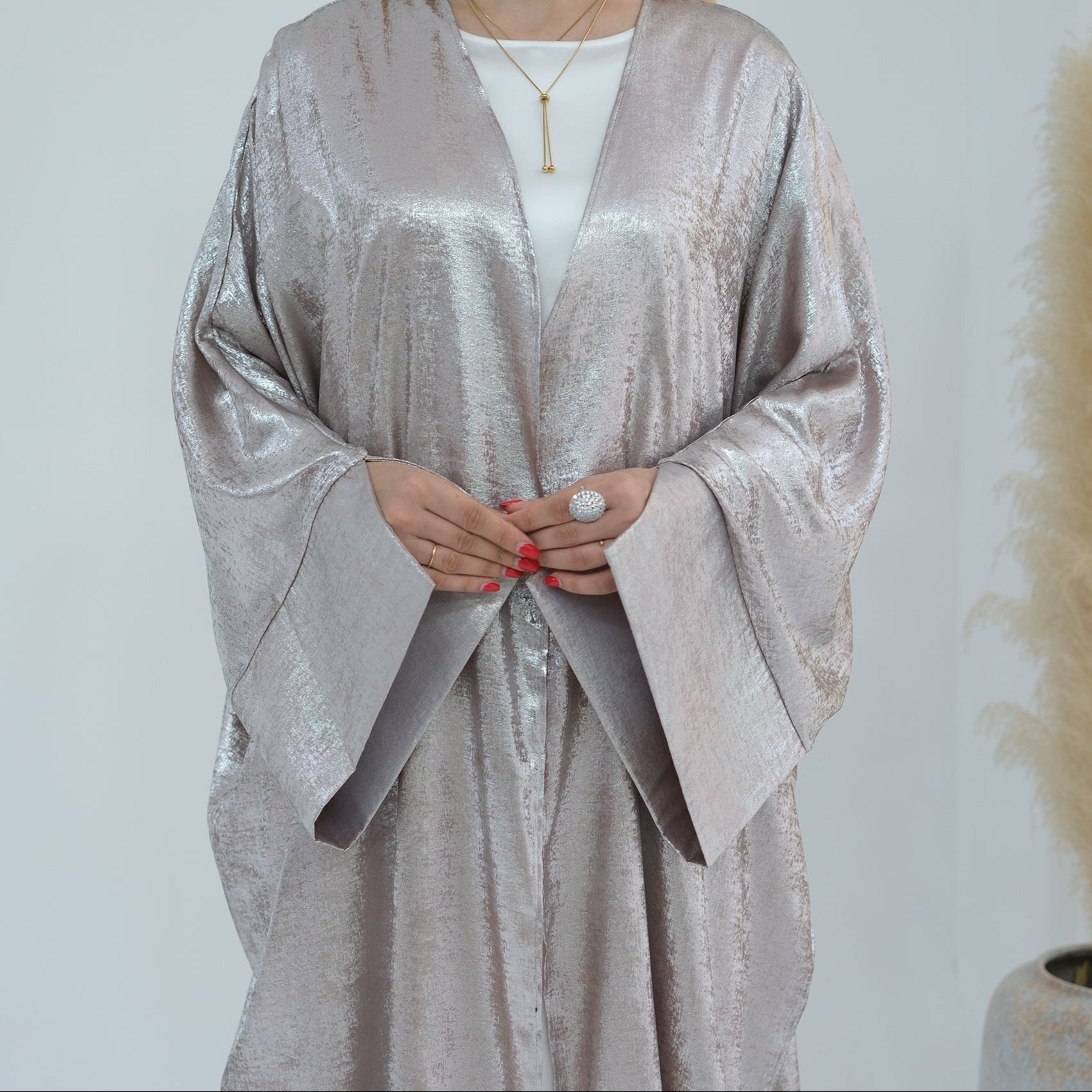 Indulge in luxury with our Hoor Metallic Open Abaya. The perfect choice for Eid or any special occasion, featuring sleeve slits. This batwing abaya set is coated in a stunning metallic finish.
