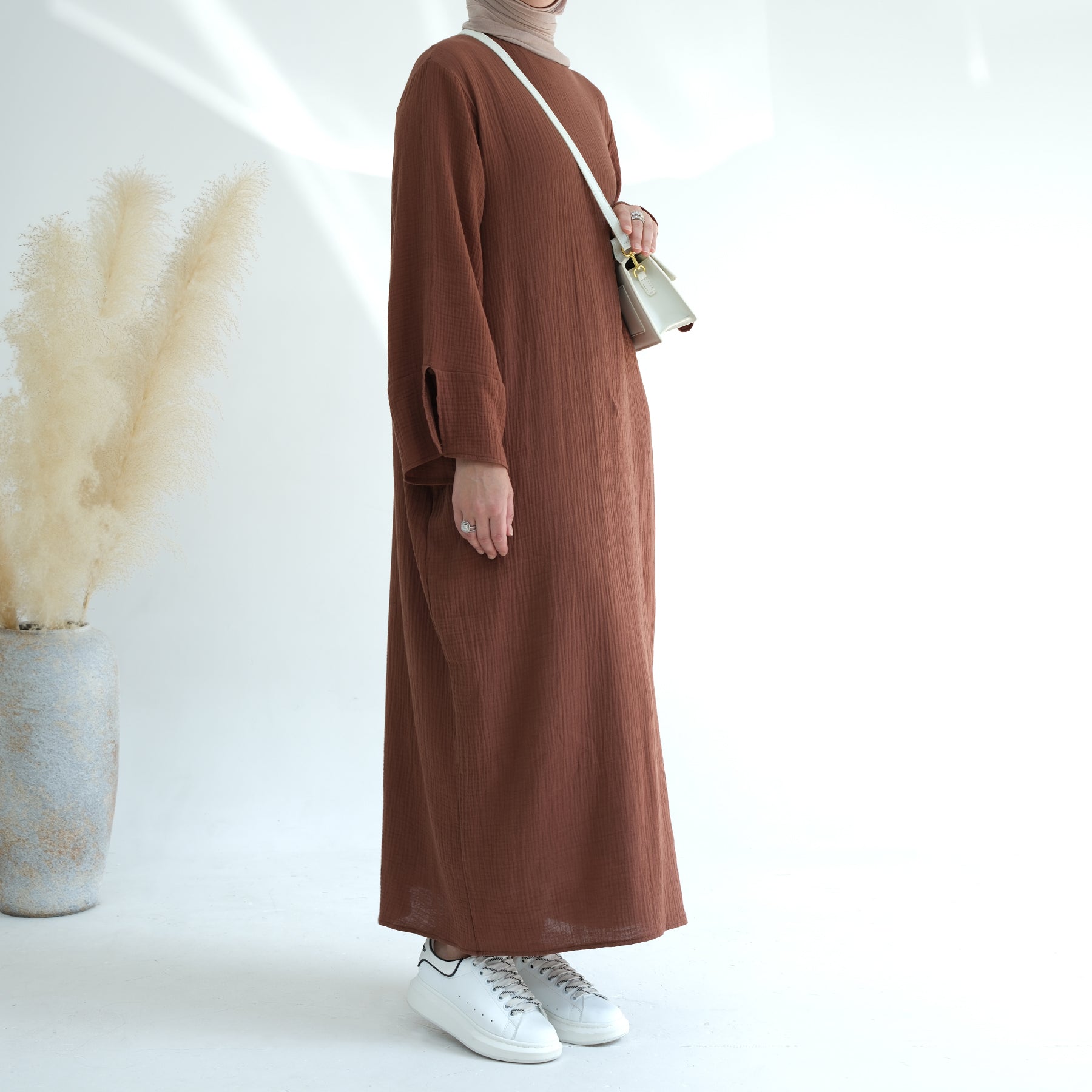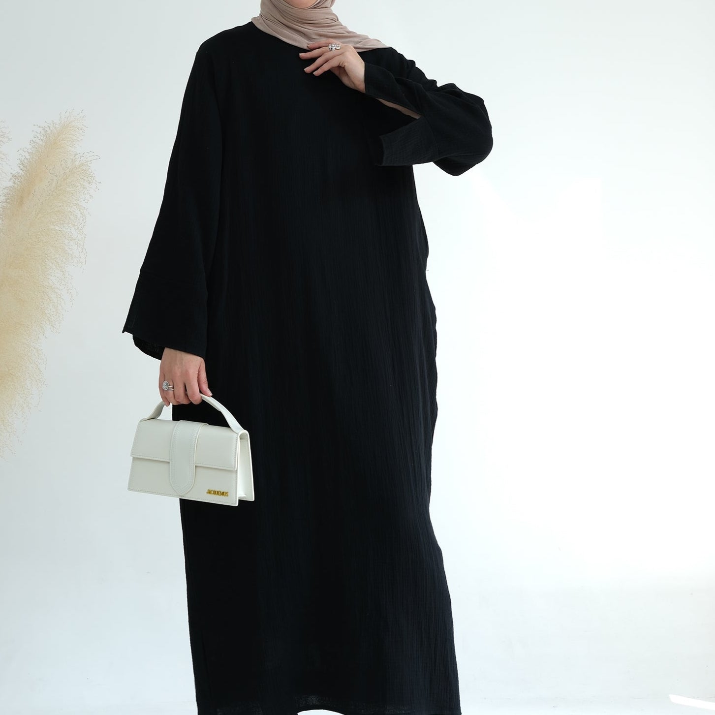 Crafted with 100% cotton, our Maha Abaya is breathable and skin-friendly. It features a loose fit cut with slit sleeves. It is ideal for warm weather conditions.