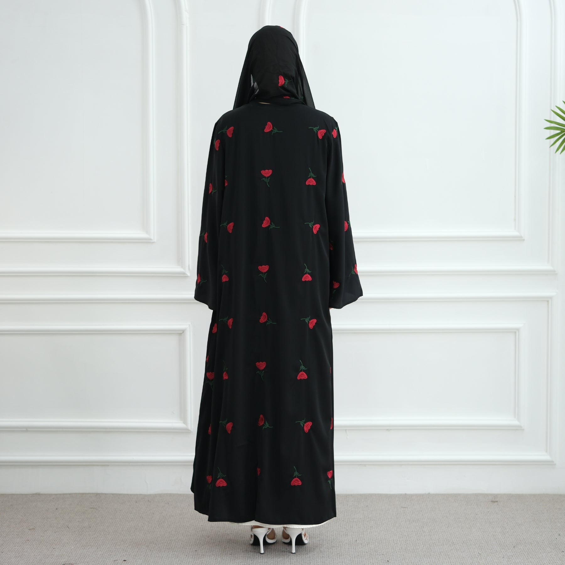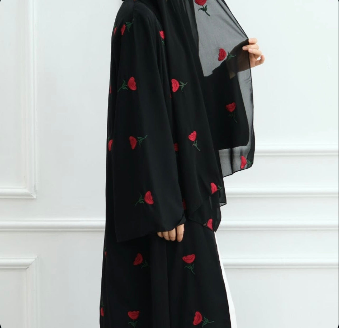 The most beautiful open Abaya with rose embroidery and matching hijab. Available in black and light grey. Ideal for special occasions.