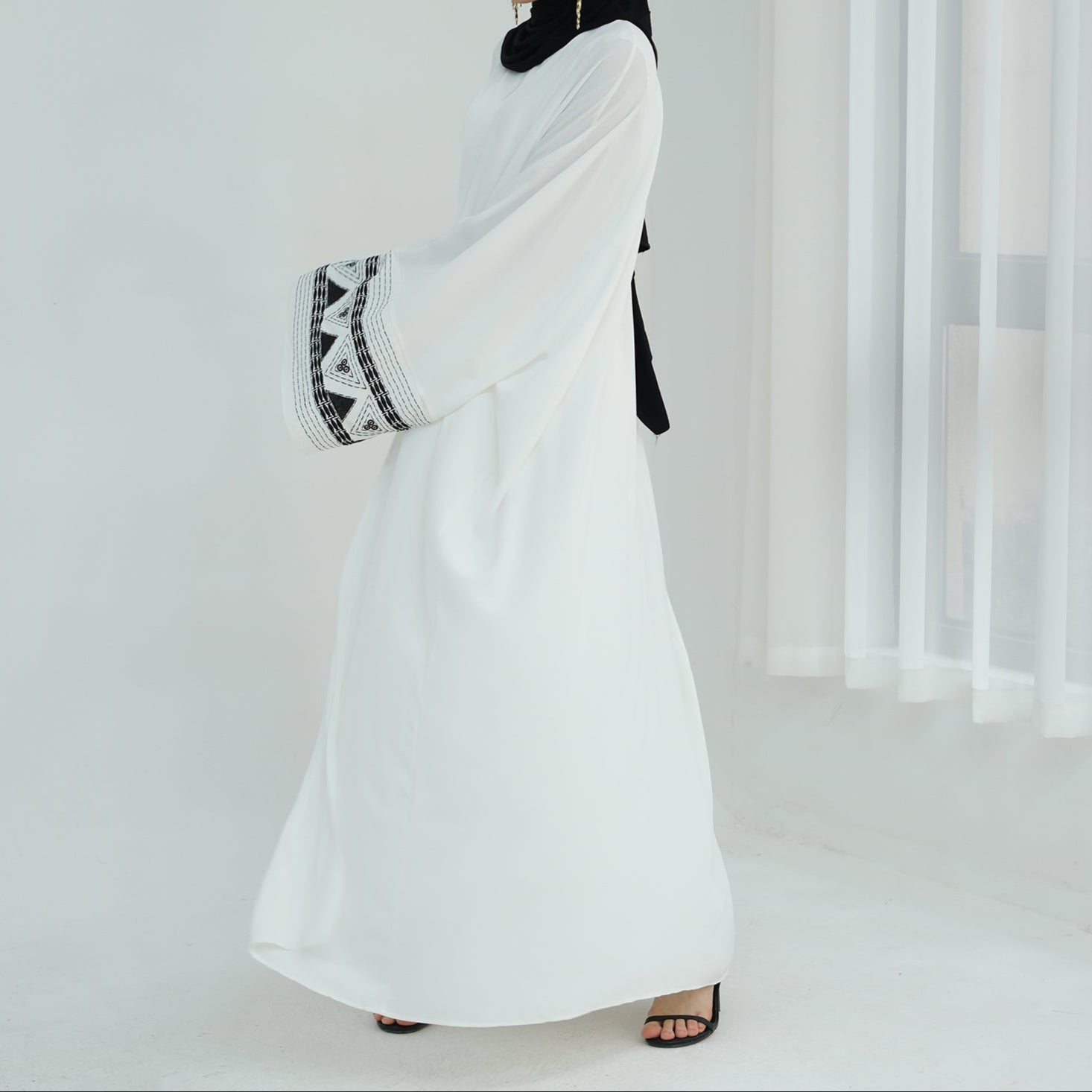 A classic open abaya with statement embroidered wide sleeves. Perfect for all occasions.