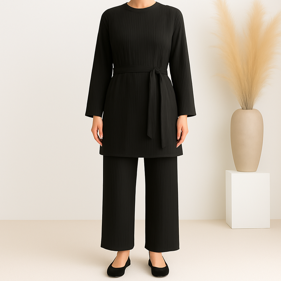 Our soft, ribbed co-ord is super stylish and versatile. It includes a loose fit top, matching belt and elasticated trousers to give you the perfect modest look.