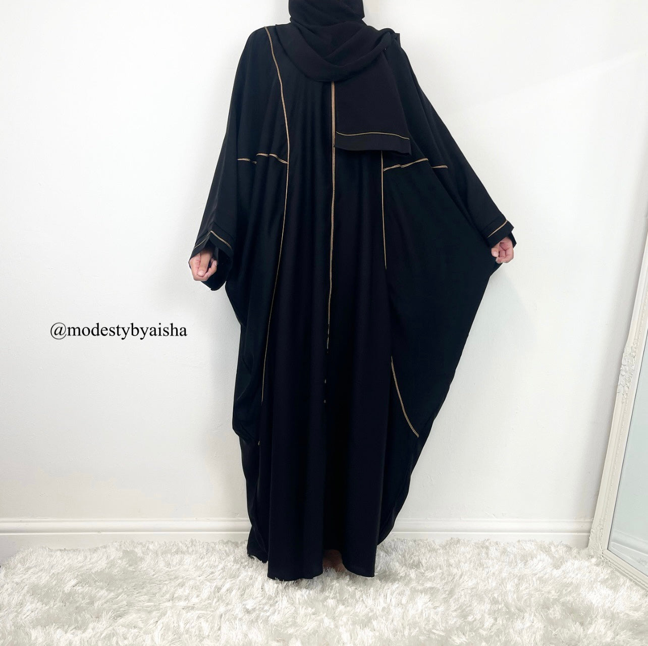 Zehra is a batwing style abaya designed with elegant brown piping around the sleeves and front. It is a loose fit which allows the high quality material to flow elegantly and gracefully. It is perfect for everyday wear, or even glammed up for an occasion!